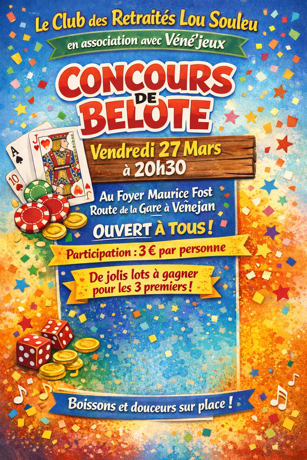 Affiche soirée Belote à Vénéjan du 27 mars 2026