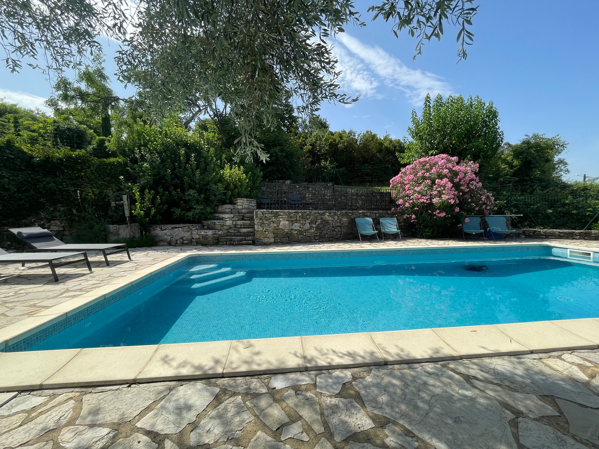 Shared areas between the three cottages (designed to preserve everyone’s privacy): a 9×4 m swimming pool to cool off during sunny summer days, with panoramic views over the Cèze Valley, barbecues and an aromatic plant corner, parking, hammock, landscaped areas with tables and chairs to enjoy a peaceful break (for lunch, reading, an aperitif, or simply relaxing).