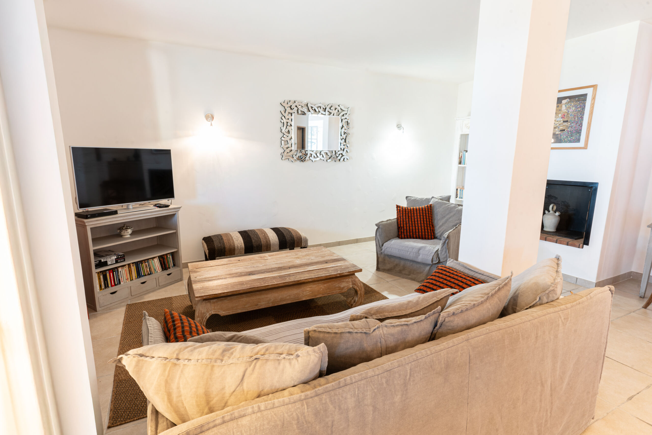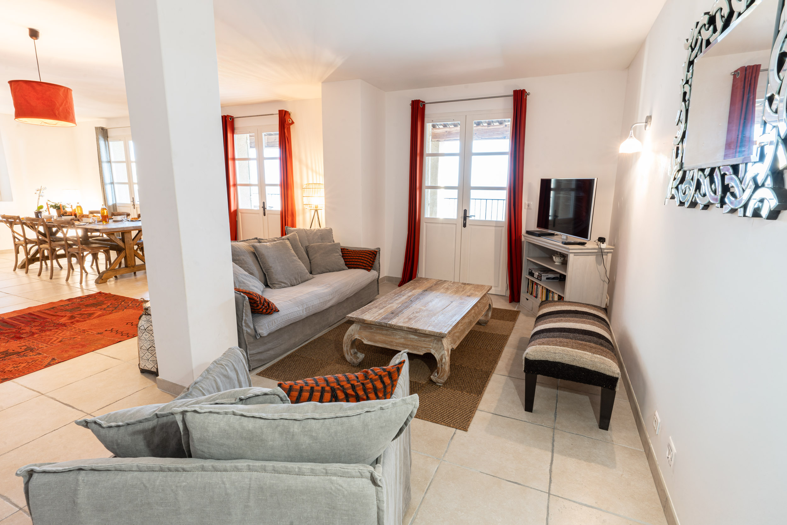 – Living / Dining room: Sofas, flat‑screen TV, coffee table, dining table and chairs