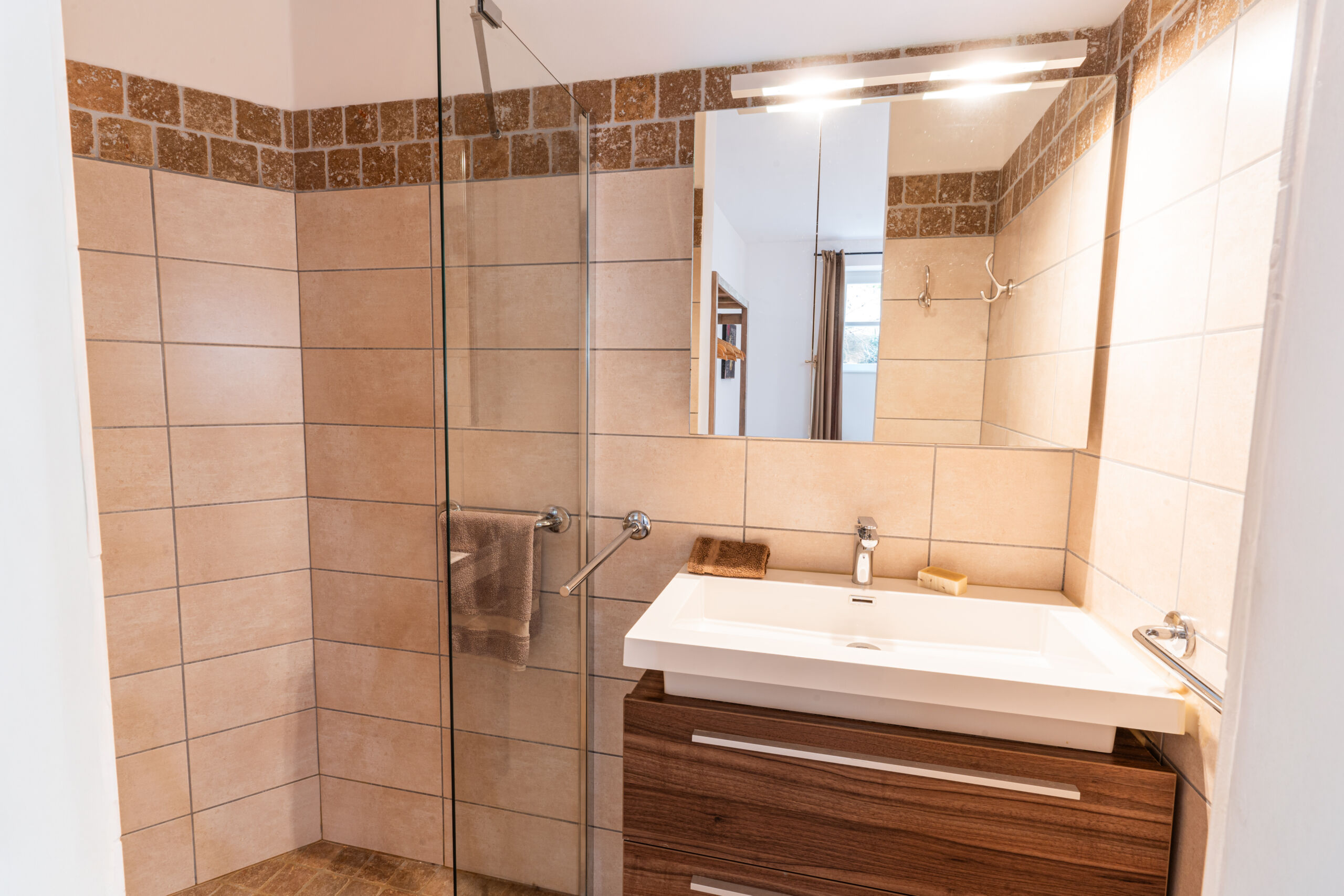 – Bedroom 1: 160 cm double bed, private bathroom with walk‑in shower