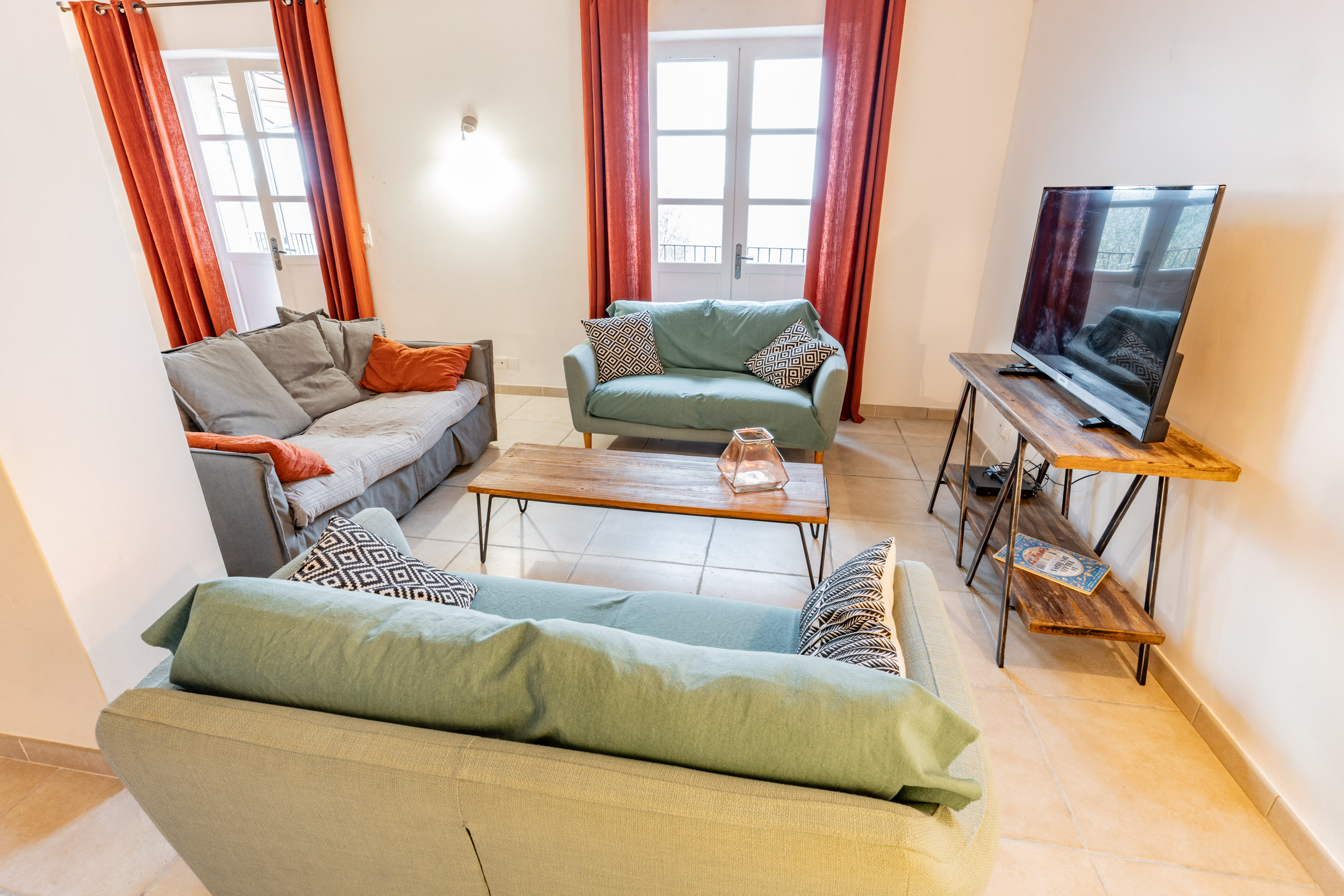 – Living / Dining room: sofas, flat-screen TV, coffee table, dining table and chairs.