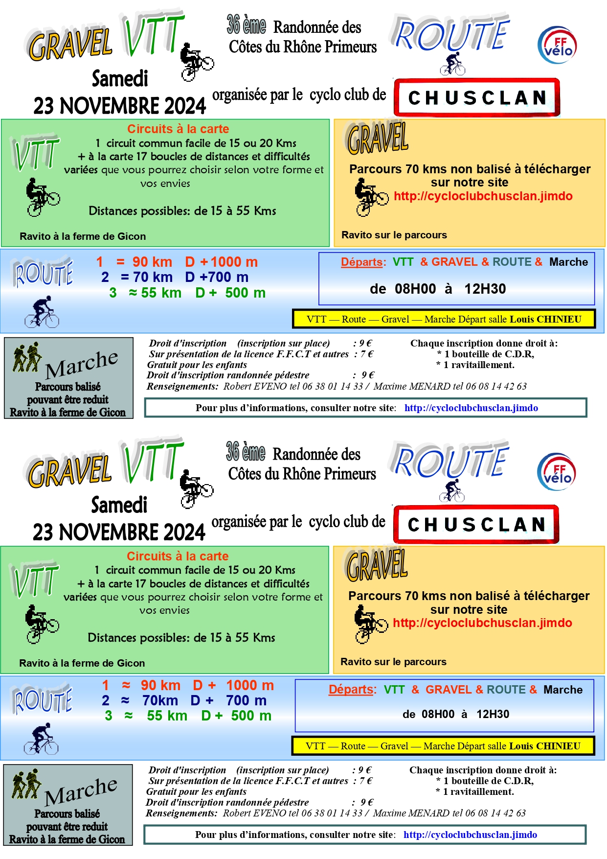 Les inscriptions à cette manifestation sont ouvertes de 8h à 12h30. Les horaires sont communs pour les 4 disciplines : VTT-Route-Gravel-Marche