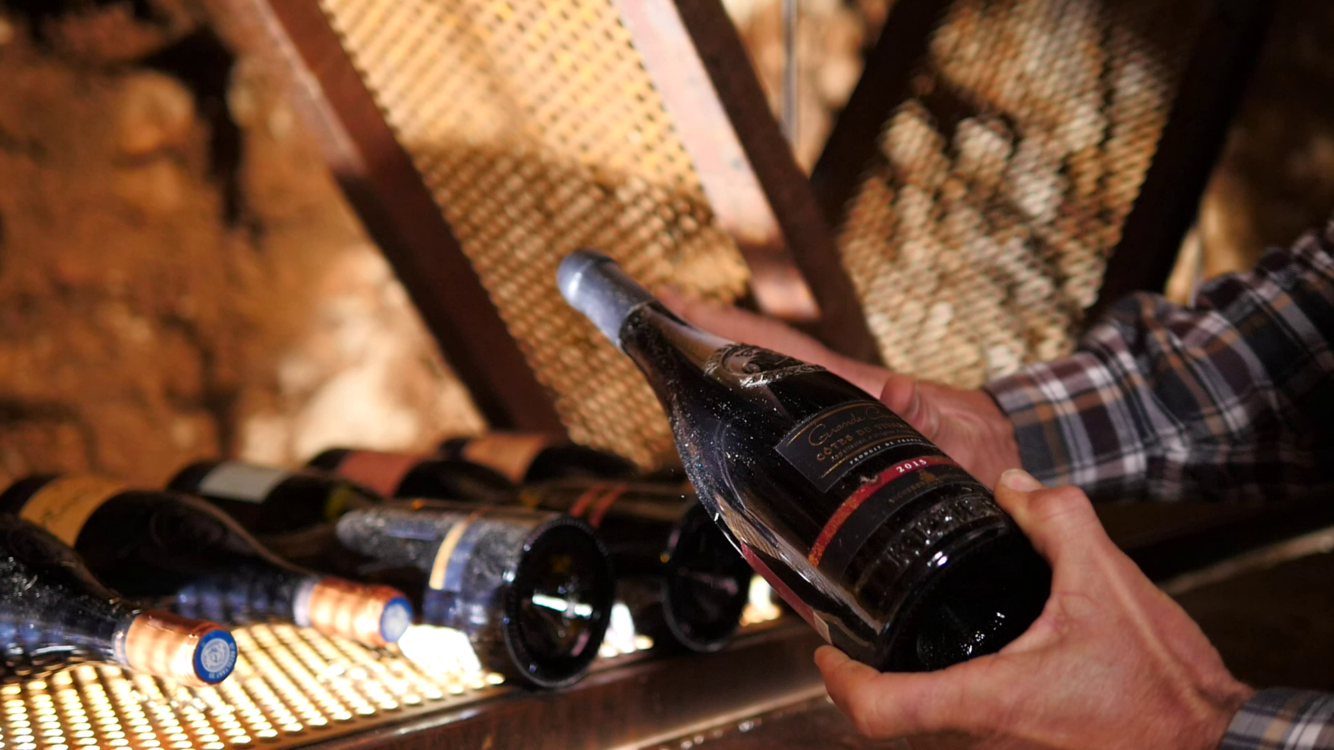 Un instant unique dans la vinothèque récemment aménagée où, 15 000 bouteilles dont le Grand Aven vieillissent depuis 2018.