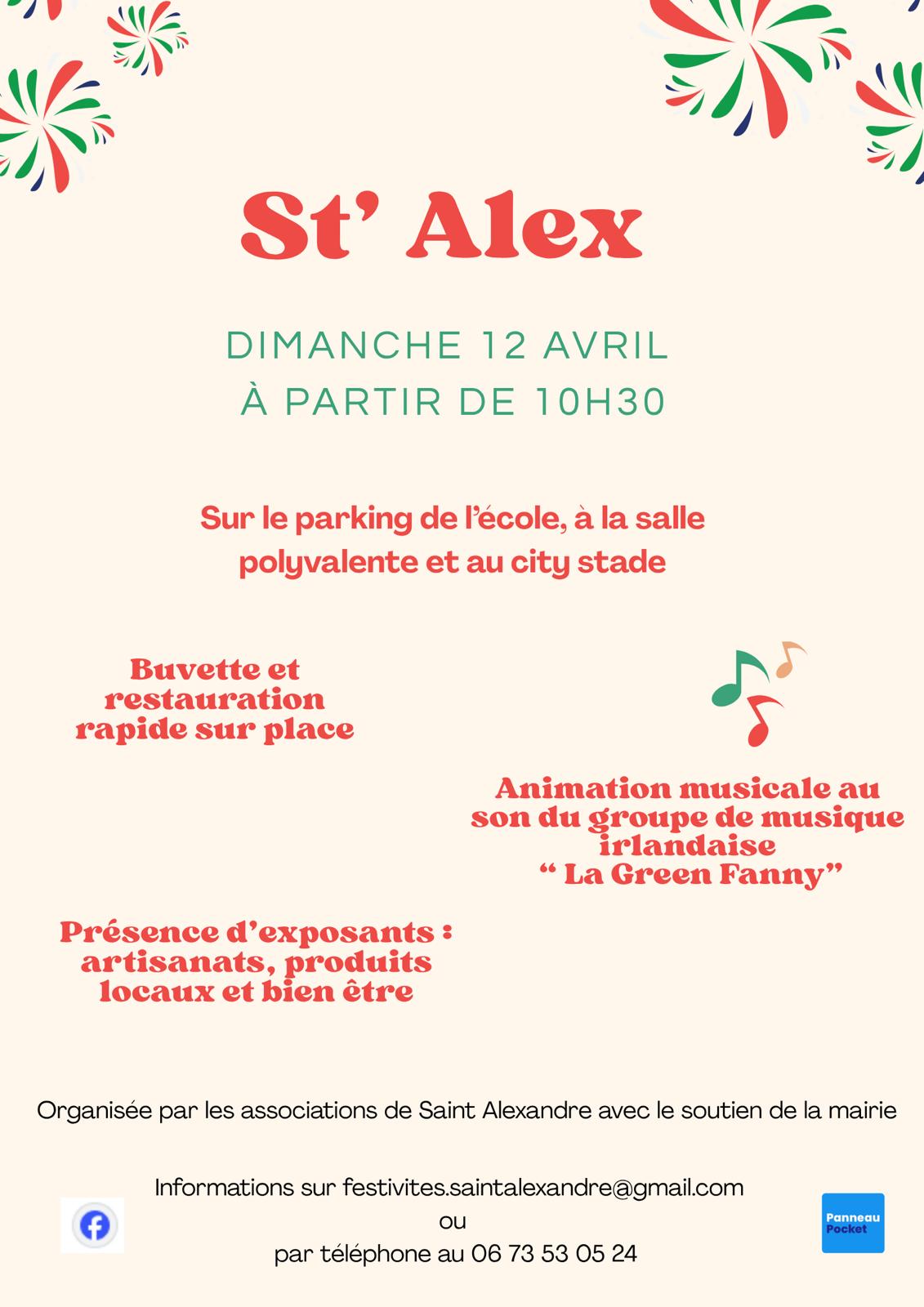 La fête de St’ Alex arrive ! Rendez-vous à partir de 10h30 pour une journée conviviale : animations, mini tournoi de foot, pétanque, démonstrations sportives, jeux, exposants, buvette et restauration.