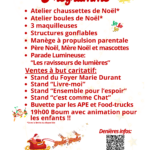Nombreuses animations tout l’après midi : structures gonflables, ateliers, maquillage, animations pour les enfants, Père Noël et ses lutins pour se mettre dans l’ambiance des fêtes de fin d’année !