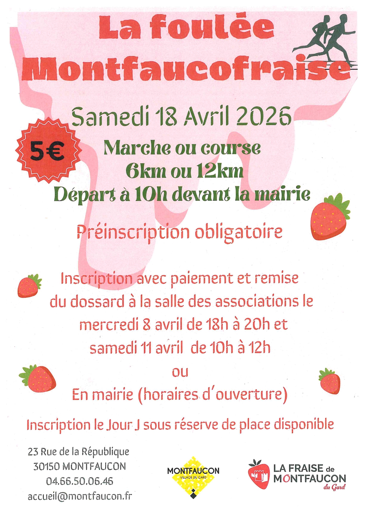 Inscriptions avec paiement et remise des dossards à la salle des associations le mercredi 8 avril de 18h à 20h et le samedi 11 avril de 10h à 12h
