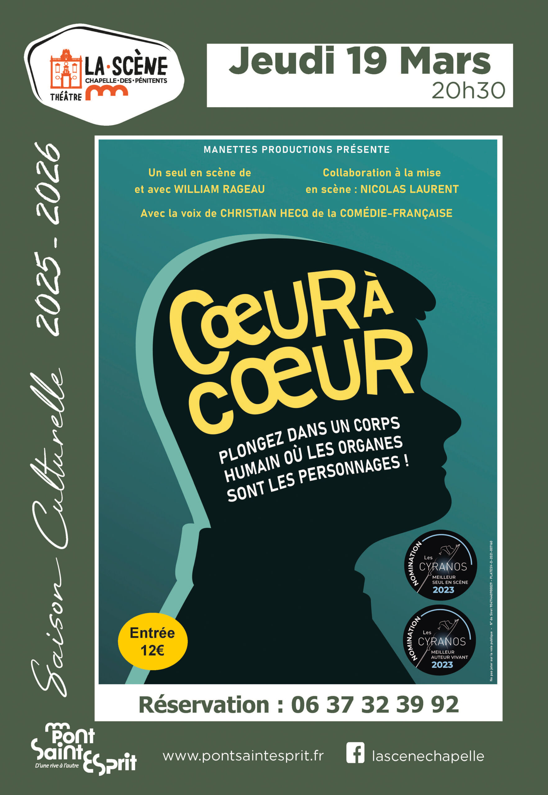 Un seul en scène à mi-chemin entre le film d’animation «Vice-Versa» et «Il était une fois… La Vie» ! Dans un corps humain, un cœur passionné, un cerveau un peu trop réfléchi et un tube digestif très peureux tenteront de faire équipe pour que leur « hôte », Guillaume, soit le plus épanoui possible… Mais la route est sinueuse et les événements de sa vie les mettront à l’épreuve, quitte à créer des situations absurdes et décalées… Un seul en scène drôle et touchant de William Rageau, avec la collaboration à la mise en scène de Nicolas Laurent, qui nous parle d’amitié, de résilience et d’amour, avec beaucoup d’humour !