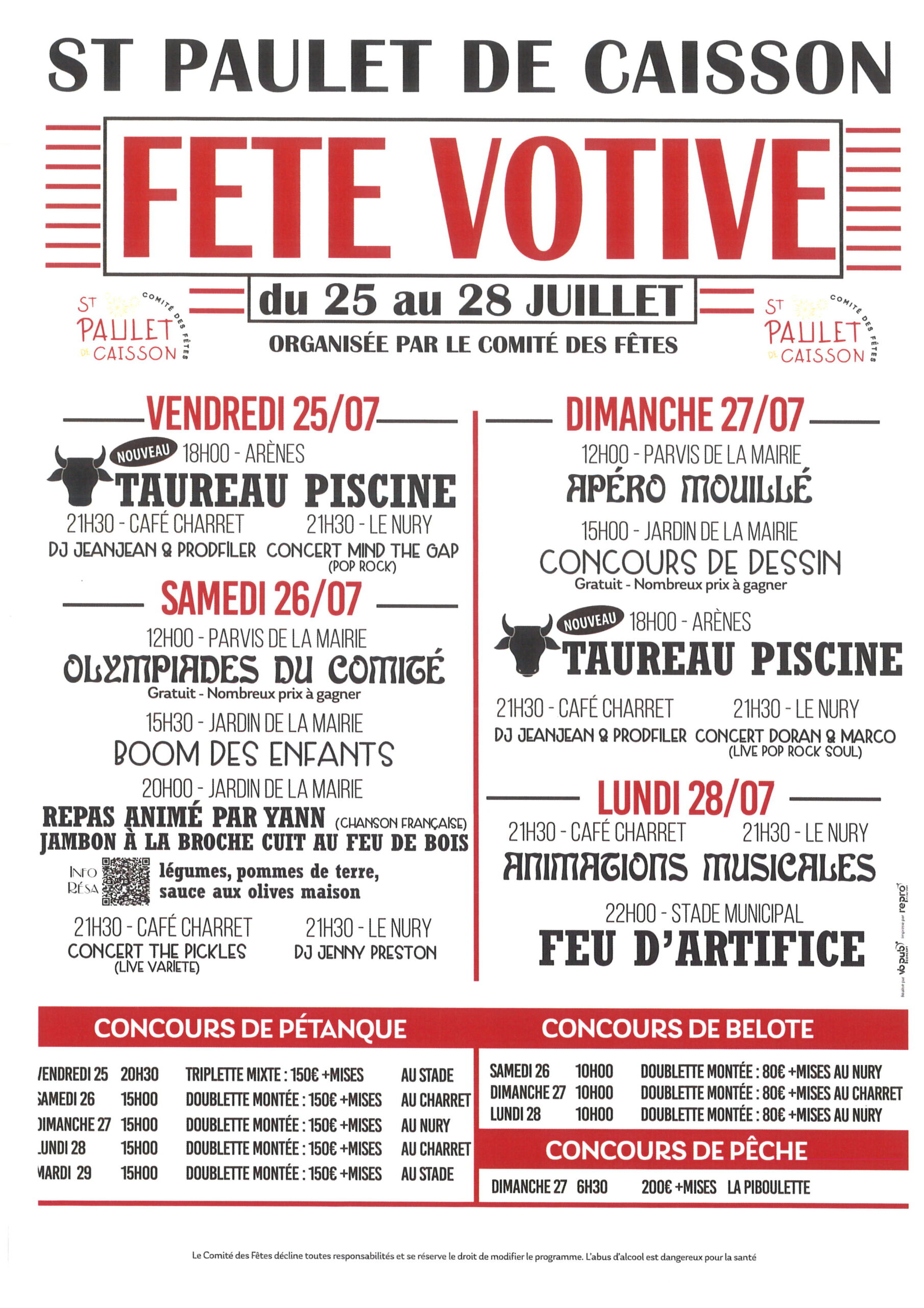 Du 25 au 28 juillet 2025, la fête votive de Saint‑Paulet‑de‑Caisson vous invite à vivre cinq soirées festives : bals, jeux taurins (taureau piscine, abrivados), concours de pétanque, repas convivial et animations pour petits et grands. »