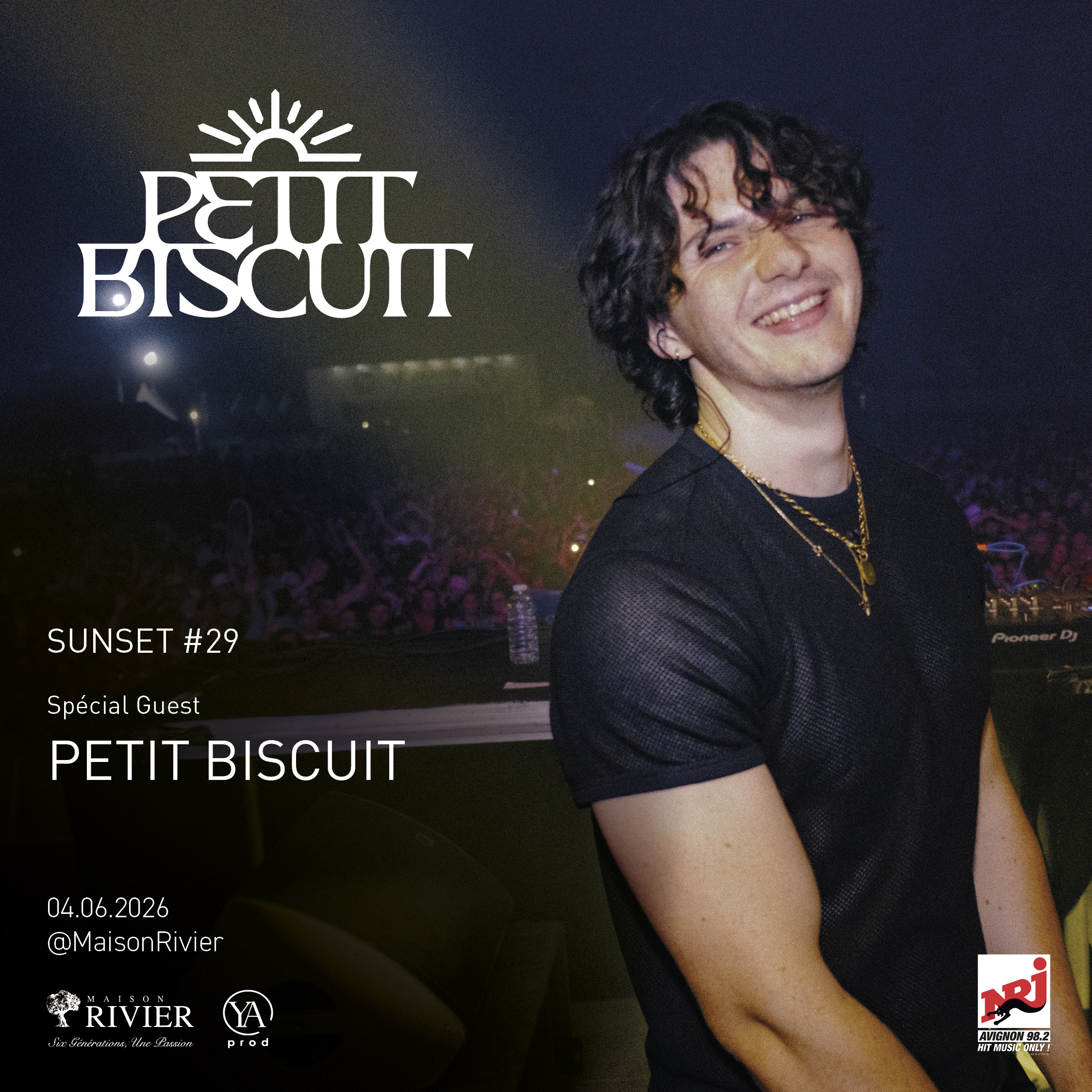 Après Bon Entendeur, The Avener, CERRONE, Synapson, Philippe Corti, Mosimann, préparez-vous à accueillir Petit Biscuit, l’auteur du tube Sunset lover, aux milliards de vues, sera chez Maison Rivier le Jeudi 04 Juin 2026.