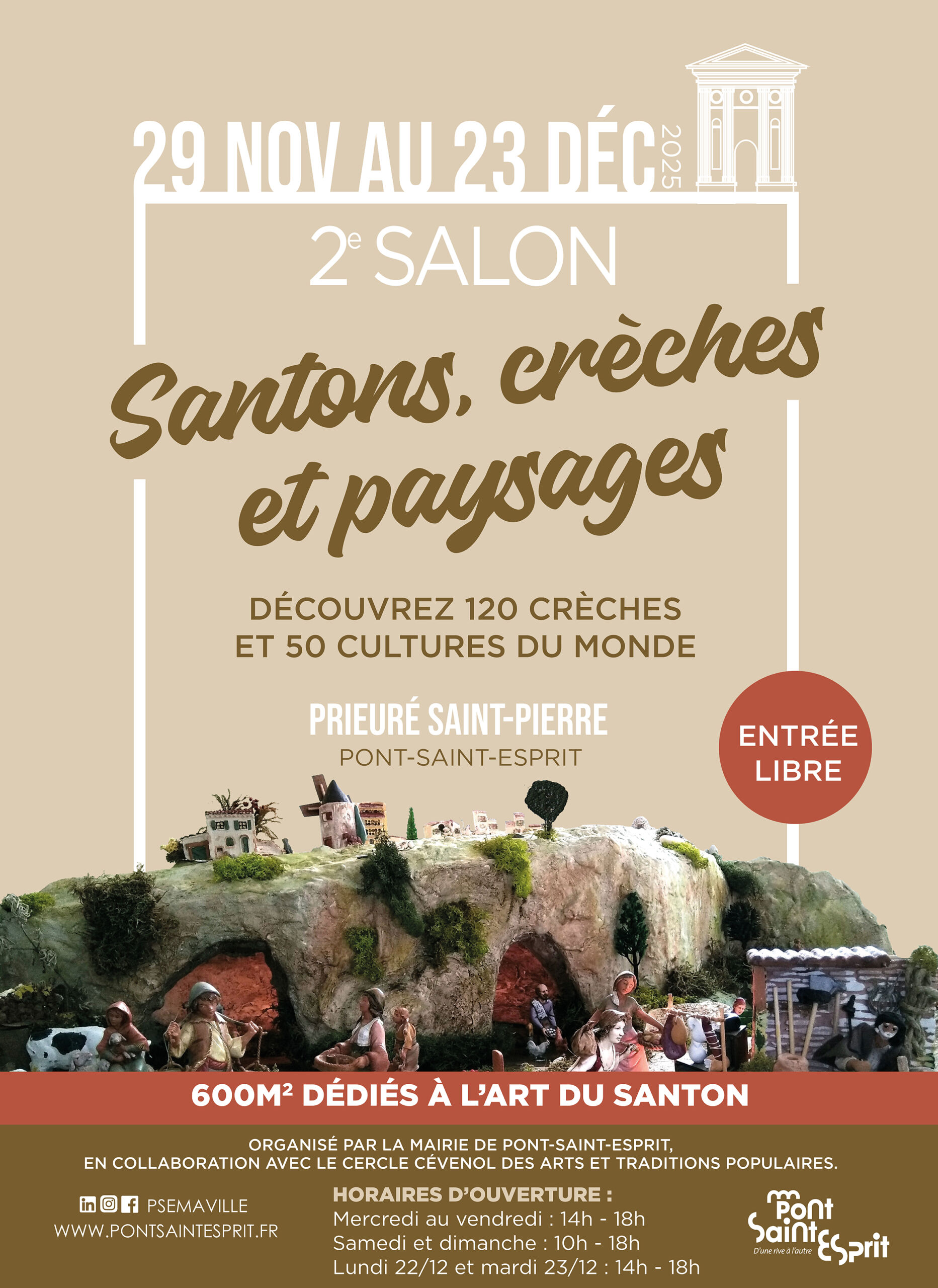 De Cévenolse Kring voor Volkskunsten en Tradities (Cercle Cévenol des Arts et Traditions Populaires) neemt in nauwe samenwerking met het stadhuis de muren van de Priorij Saint-Pierre in gebruik. 600 m2: een buitengewone tentoonstelling in Pont-Saint-Esprit Ontdek in de verschillende scenografieën kerststallen uit diverse culturen, landschappen van de Camargue, kostuums uit de Franse provincies, een beroependorp dat meer dan tweehonderd ambachten van de middeleeuwen tot nu in de kijker zet, en nog veel meer uitzonderlijke ambachtelijke creaties! Activiteiten die u onderdompelen in de magie van de Santons Gedurende de hele tentoonstelling zijn er verschillende activiteiten gepland. Bezoekers kunnen een beeldenmuur ontdekken die de geschiedenis van de kerststal volgt, van de eerste eeuwen tot nu, deelnemen aan rondleidingen op afspraak, Santon-makers ontmoeten en met hen in gesprek gaan, de vervaardiging van Santons ontdekken via praktische workshops en nog veel meer. Voor liefhebbers en mensen die op zoek zijn naar cadeau-ideeën, wordt er in het hart van de Priorij een kleine Santons-winkel met ambachtelijke creaties ingericht.