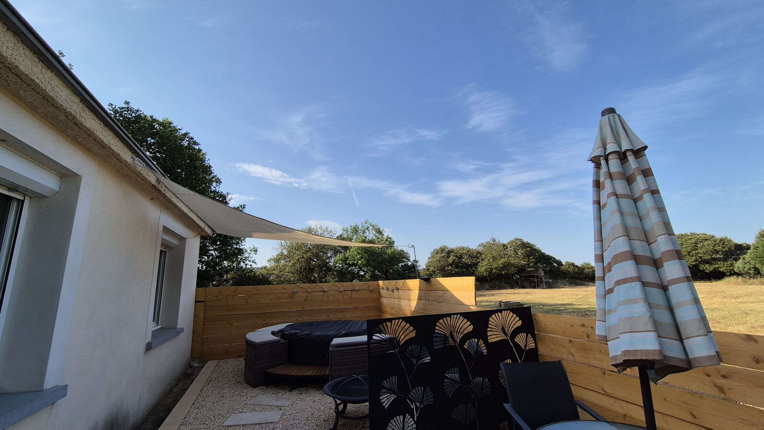 > Een privéterras met eethoek, ontspanningsruimte met vuurplaats en jacuzzi